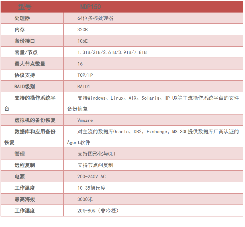 NCS NDP100(简称NDP100)系列是集备份服务器、备份介质、备份软件于一体的产品,集成的全局客户端重复数据消除技术,使 VMware 环境、远程办公室、企业应用程序、LAN/NAS服务器以及台式机/笔记本电脑的日常完整备份变得更加方便快捷,为关键业务提供全面的数据保护。