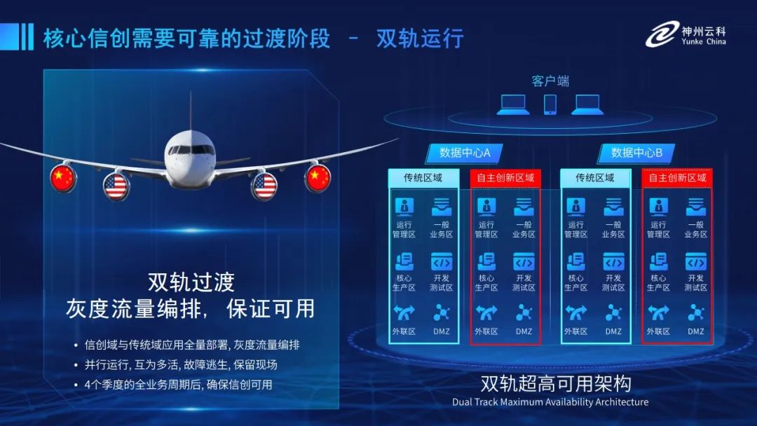 为帮助客户更好地应对数字经济时代对应用可持续性的高要求,实现信创与数字化兼得,MK体育(国际)官方网站-MKSPORTS 推出了双轨超高可用架构。双轨超高可用架构在双活数据中心的分区调度基础上,增加信创域和非信创域的分域调度,实行信创域与传统域应用全量部署,使双中心运营变为双中心四区域并行运行,互为多活,将传统架构变为分区分域协同的多活双轨超高可用架构。帮助客户在新架构下,保障“信创”的同时解决性能瓶颈,提升稳定性,保证应用可持续性,最终实现信创区域和非信创区域的平滑过渡,完成国产化替代目标。”